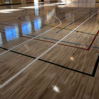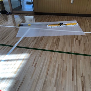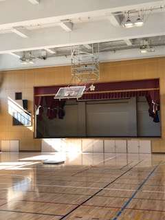 そうじのためにバスケットボールのゴールを動かしています。(下の写真)