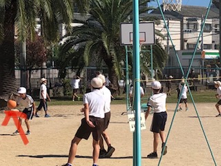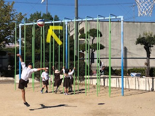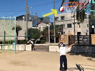 バスケットボールもうまくなってきています。矢印のところにボールがあります。