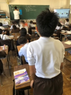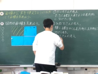 黒板の青い図の面積の求め方を考えていきます。児童が自分の考えを発表しています。