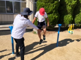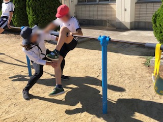 走り幅跳びと並行して鉄棒もしています。教員が補助をして足かけ上がりにチャレンジしています。