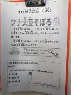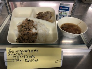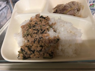 今日の給食には、ツナ、大豆などで作られたそぼろをごはんにかけて食べました。
