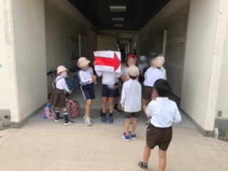 昨日教員が持っていた矢印を、今日は児童が持って立っていました。
