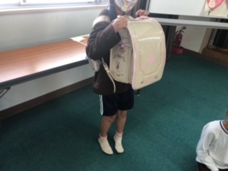 ランドセルの中には物が入っています。その重くなったランドセルを前に抱えて妊娠中のお母さんの大変さを擬似体験していきます。