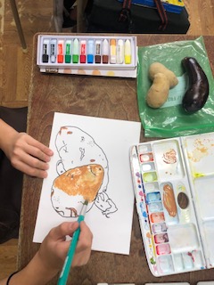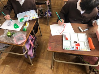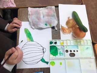4年生の教室では、野菜や果物を置いて、色や塗り方を考えながらていねいに絵を描いていました。パレットの上を見ると、子どもたちが色を工夫していることがわかります。