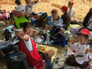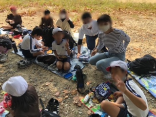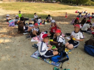 だいぶ歩いたのでおなかもすいています。たてわり班でのお弁当タイムを楽しんでいます。