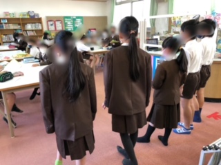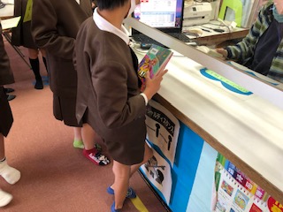 図書係の子どもたちが前で話をしています。その後、本の返却・貸し出しとなりました。