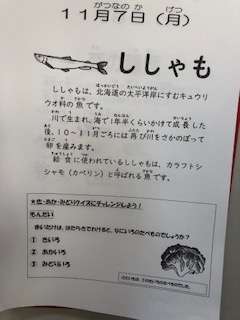 給食カレンダーに、今日の食材であるししゃもの説明が書かれています。