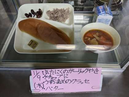 今日の給食の献立は、豚肉のガーリック焼き、ケチャップ煮、うずらまめのグラッセ、コッペパン、バター、牛乳です。