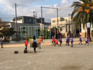 いつもは体育館を使っているクラブは、作品展で使えないため、運動場でバスケットボールをしていました。