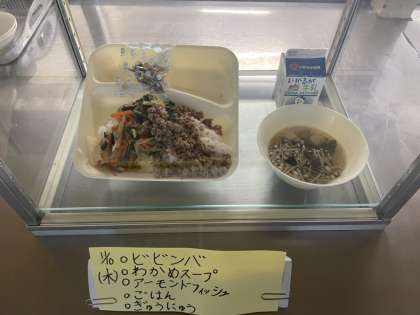 今日の給食の献立は、ビビンバ、わかめスープ、アーモンドフィッシュ、ごはん、牛乳です。