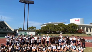 6年生が、競技場のトラックをバックに集合写真を撮りました。がんばって走りましたね。