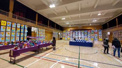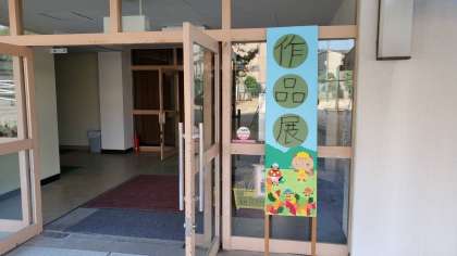 作品展は床が新しくなった講堂で行っております。写真の時間は5年生が鑑賞しています。