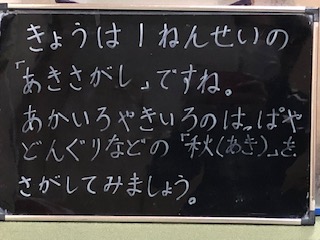今日は、1年生が「秋さがし」に出かけます。葉っぱの色も赤や黄色になってきていますね。木の下にはいろいろな木の実が落ちていることでしょう。他にもいろいろな「秋」に気づいて、たくさんの秋を見つけてください。