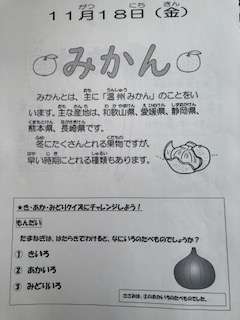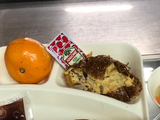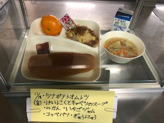 今日の給食はオムレツでした。ケチャップもつきました。みかんもデザートとしてでました。
