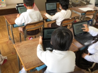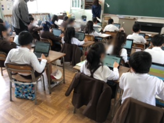 一人一台端末の学習用ソフトを学んでいます。担任の他の教員も教室に入って子どもたちをサポーターしています。