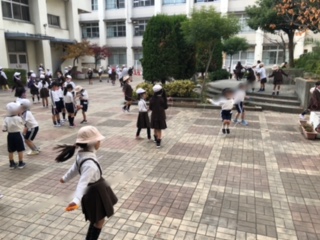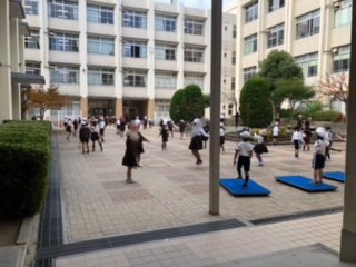 運動場で2学年ごとになわとびの取り組みをしている時に、中庭では他の学年の子どもたちが自主的になわとびの練習をしていました。
