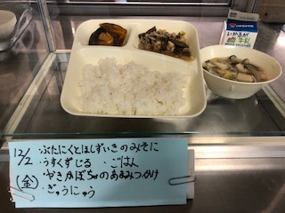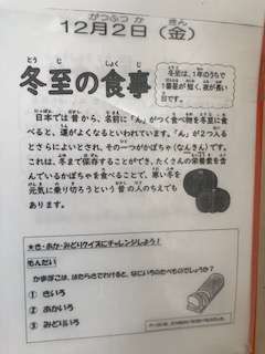 今日は冬至がある月にちなんで、かぼちゃ(南京)がでました。今日の給食カレンダーには冬至に食べる食べ物が書かれています。