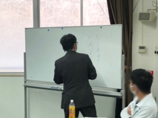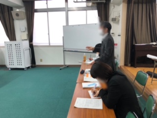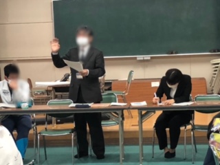 研究討議会では授業を見られた教育センターの指導担当の方が教員に指導されています。