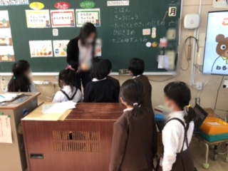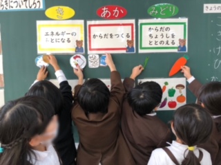 黄色(エネルギーのもとになる食べ物)・赤色・赤色(体を作る食べ物)・緑体の調子を整える)食べ物について、分けていきます。
