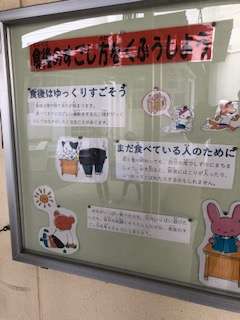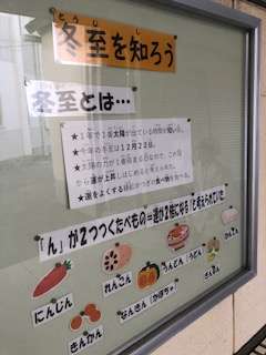 給食室前には、給食に関する掲示があります。もうすぐ訪れる冬至と食べ物との関係についても掲示されています。