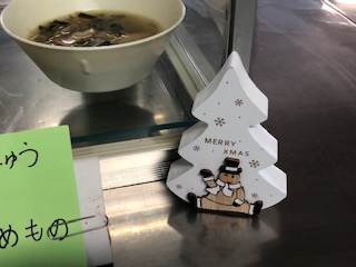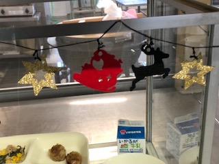 給食室の献立見本にはクリスマスの飾りが置かれています。