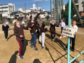 上の写真 6年生はバスケットボールをみんなで楽しんでいます。