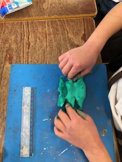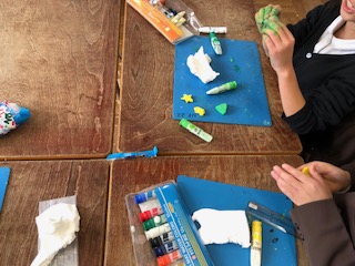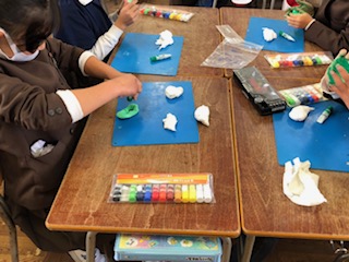 子どもたちが粘土に色をつけて何かを作っています。さて、何でしょうか?