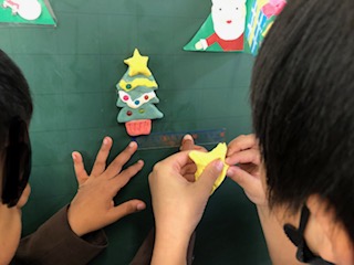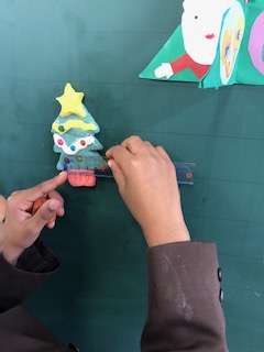 子どもたちはクリスマスツリーを作っています。担任が作った見本を参考にしています。