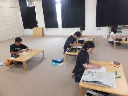 7月27日(火) 午後から習字の研修をしました。講師は2年生の三好先生です。子ども達に指導する方法を真剣に学びました。筆の運びやとめ・はね・はらいなど、ていねいに研修しました。