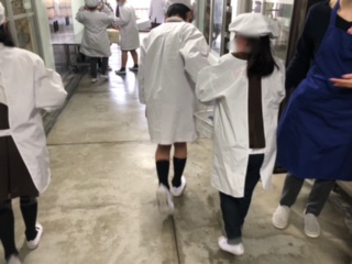 給食室の中で子どもたちはおかずやパンなどを受け取っています。