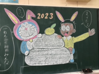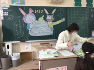 黒板にはお正月らしい絵が描かれています。