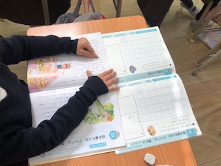 子どもたちの机の上には教科書と道徳ノートが置かれてあります。