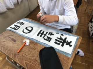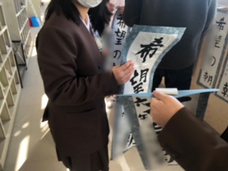 新年といえば書き初め。6年生が書き初めの習字を廊下にはっているところです。