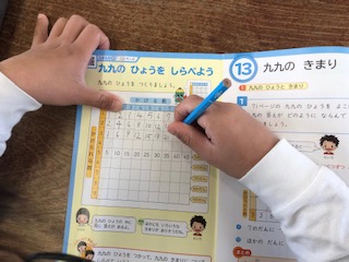 算数で九九を学んだ2年生は、九九について引き続き学習をしながら定着を図っています。今日は九九の表をかいて九九のきまりを知っていきます。