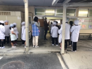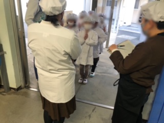 給食室に入る前にはこのように並んで、あいさつをしてから給食室に入ります。