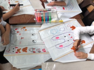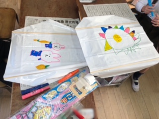 たこを作っています。カラーペンで楽しい絵を描いていますね。うさぎの絵もたくさんありました。