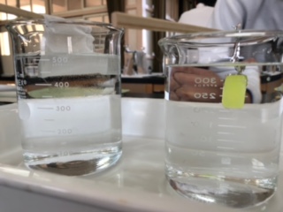 物の溶け方についての実験です。右のビーカーには飴(あめ)が水につけられています。よく見ると少しずつ溶けているのがわかります。