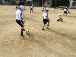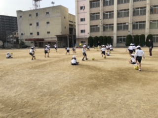 1年生は運動場と体育館とに分かれて体育をしています。運動場ではボールを使った運動をしていました。