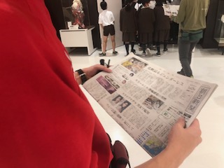 輪転機で夕刊を印刷するところを見学しました。担任に、刷ったばかりの新聞が渡されました。