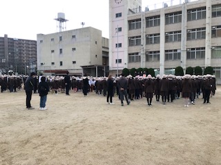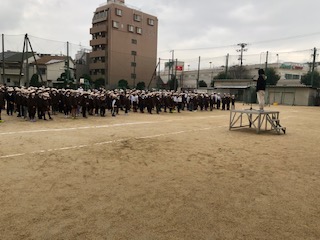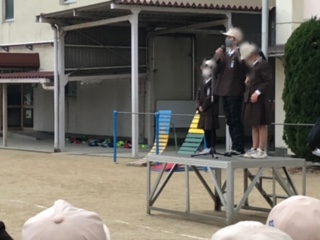 今日の児童朝会では、校長から阪神淡路大震災の学校での体験などの話がありました。担当の教員から先週の様子などが話されました。