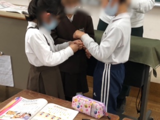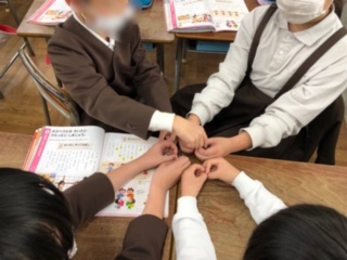 わらべ歌の学習では、ずいずいずっころばしの歌でグループで手遊びをしていました。