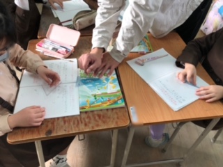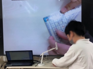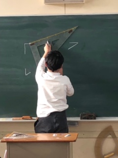 今日は三角定規の角について学習しています。ノートに書いて考えたり、黒板や実物投影機を使って発表したりしています。