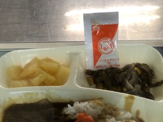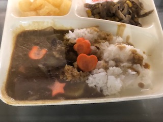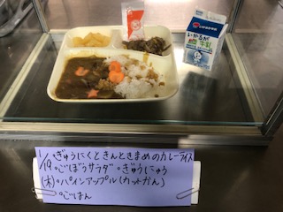今日の給食は、子どもたちの大好きなカレーライスです。牛肉、ラッキーにんじん、そして、金時豆も入っています。