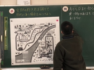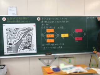今日の授業では、出発地点から終点まで行くのにどのような行き方があるのかを樹形図を使って考えました。