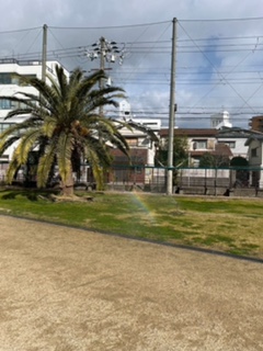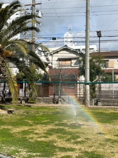 メンテナンス後にスプリンクラーで水をまきました。虹が見えます。作業された方々をねぎらっているようですね。