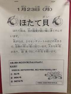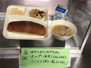 今日の給食には、ほたて貝のグラタンからでました。和梨もつきました。