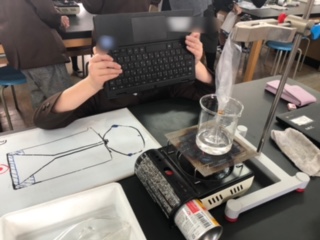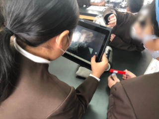 子どもたちは班で相談して決めた実験方法で実験しています。実験の様子などを端末で撮影しています。