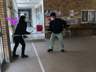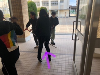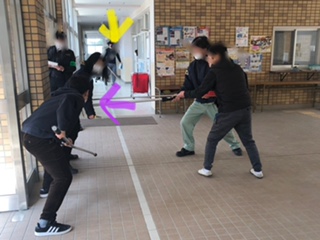 紫色が犯人役(女性警察官)です。管理作業員、教員がさすまたやほうき、棒などで犯人役を制止しています。黄色は緊急放送を聞いて駆けつけている教員です。