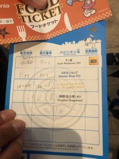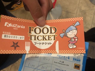 子どもたちは、パビリオンでのチケットとフードチケットを受けたっています。このフードチケットを使って昼食を食べます。