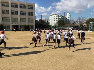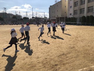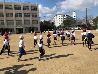 2時間目の後の休み時間に1年生と2年生がかけ足をしています。
